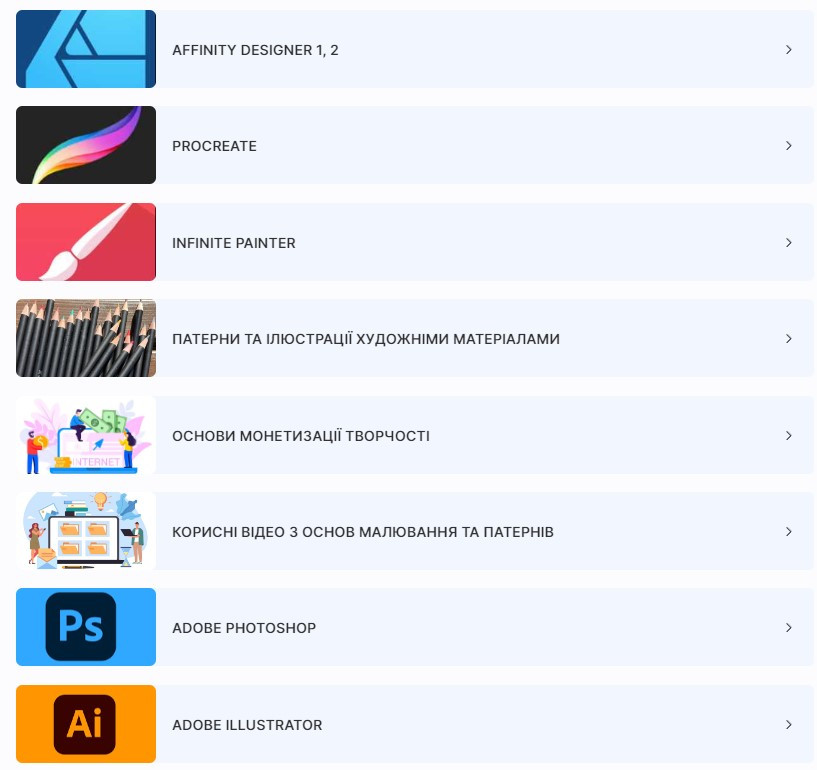 ❗️ВИ ОТРИМАЄТЕ ДОСТУП ДО 122 УРОКІВ, СЕРЕД ЯКИХ Є УРОКИ В PROCREATE, AFFINITY DESIGNER 1,2, INFINITE PAINTER, PHOTOSHOP, ILLUSTRATOR ТА УРОКИ РУЧНИМИ МАТЕРІАЛАМИ.