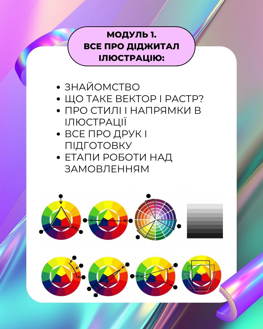 ✅ Зрозумієш основи цифрової ілюстрації — від стилів та напрямків до розуміння кольорових профілів та технічної підготовки макетів до друку.