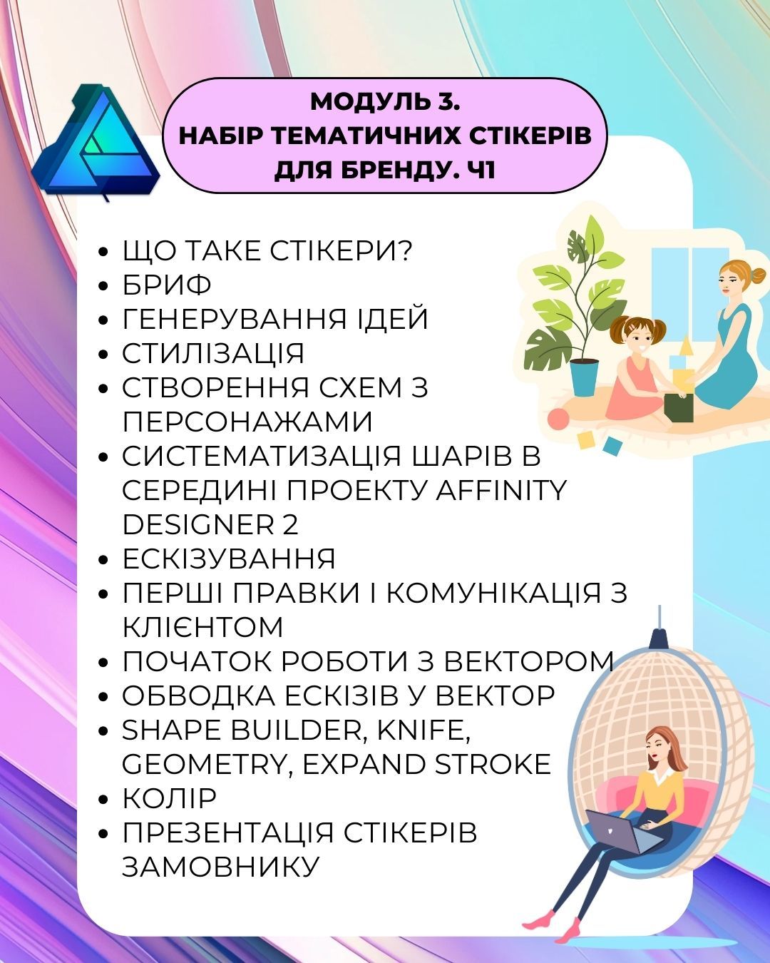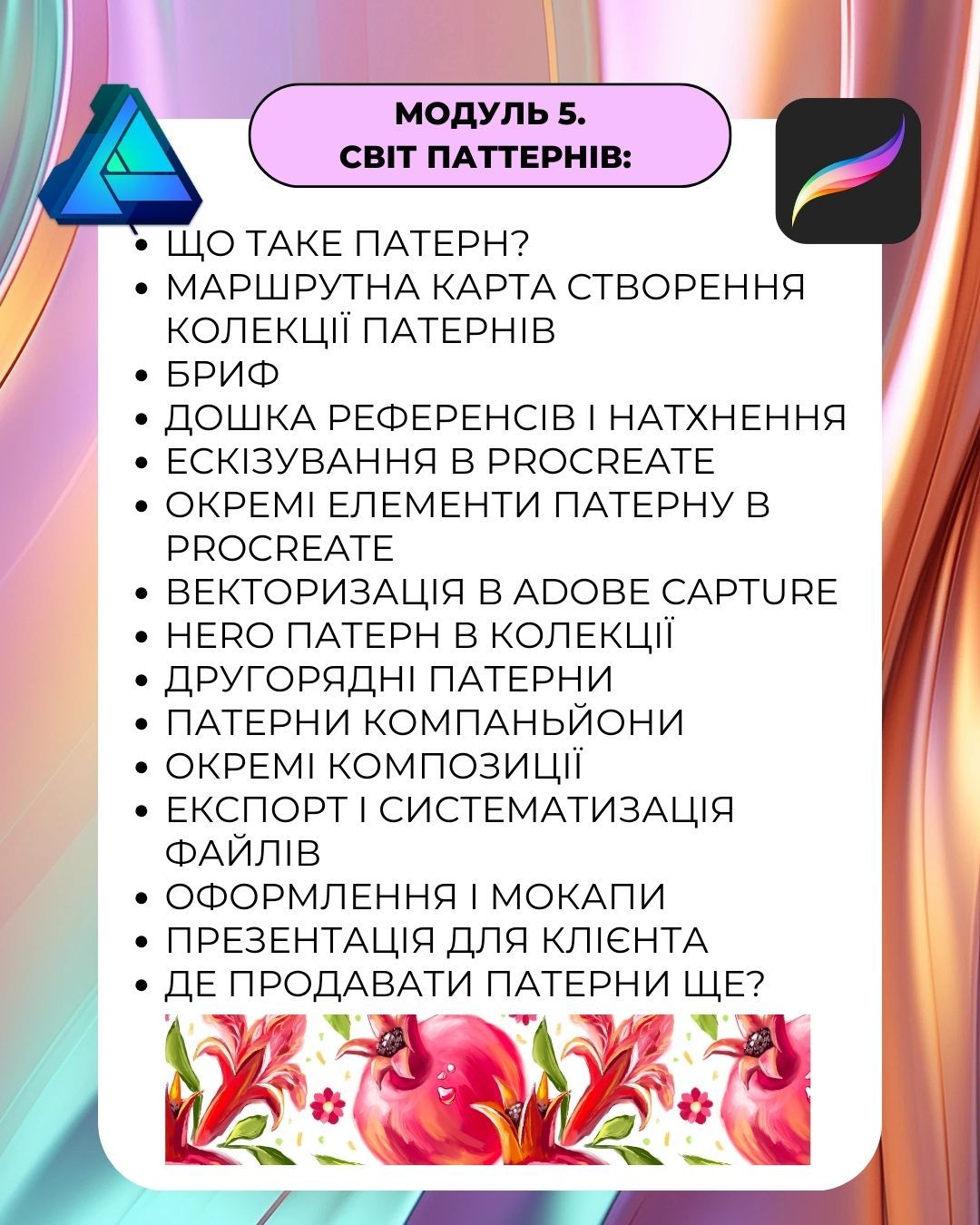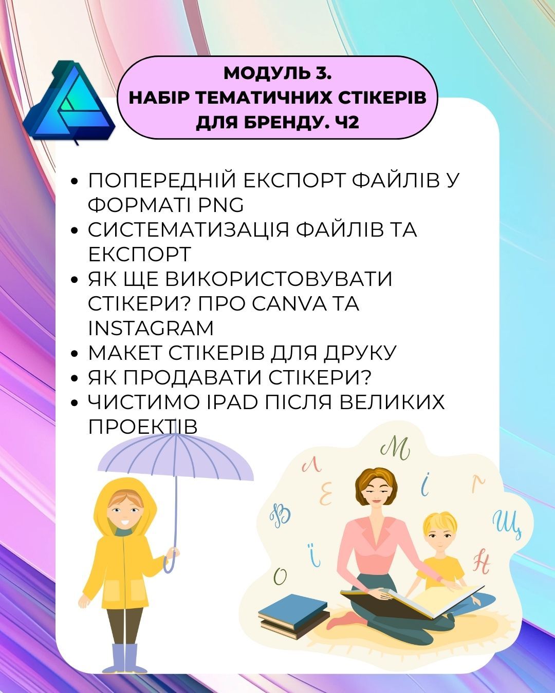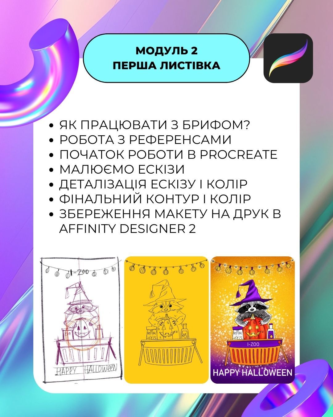 ✅ Повністю опануєш Procreate* та Affinity Designer — два ключові інструменти сучасного ілюстратора.