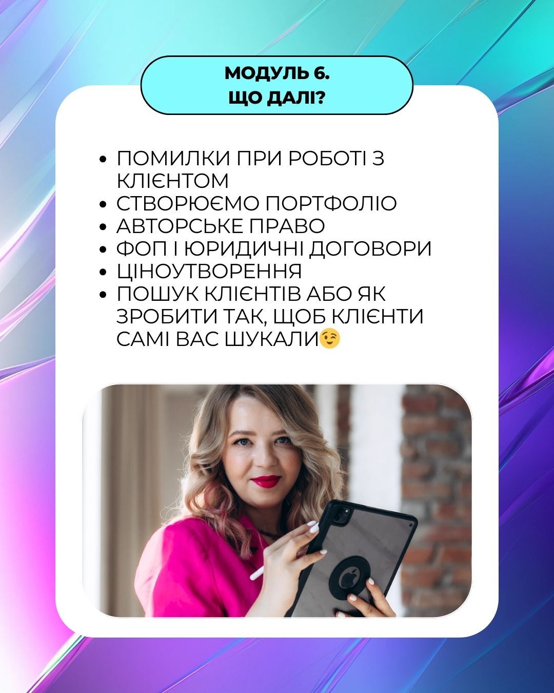 ✅ Розберешся в юридичних і фінансових аспектах — авторське право, ФОП, договори, ціноутворення.